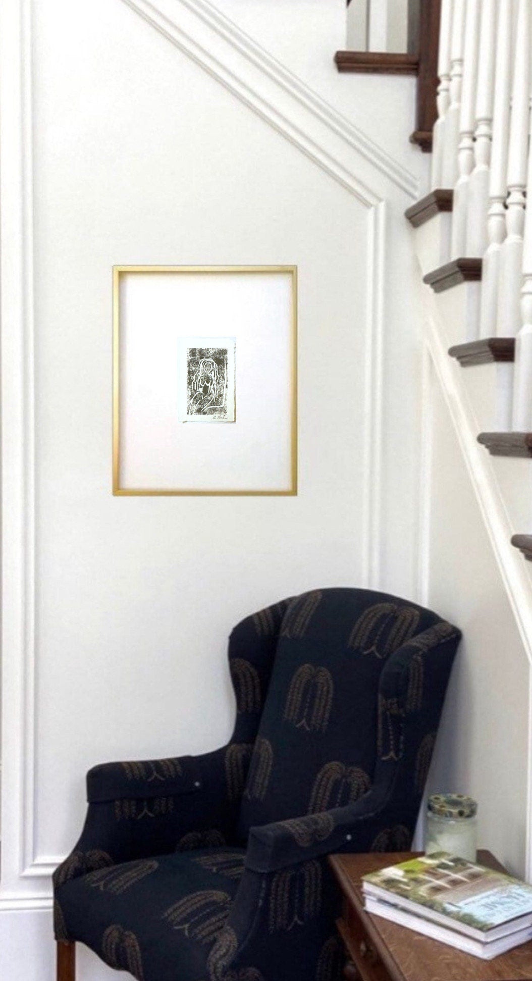 This listing is for an original abstract monoprint featuring a nude female figure on premium paper matted in white and framed in a gold metal gallery frame with glass.