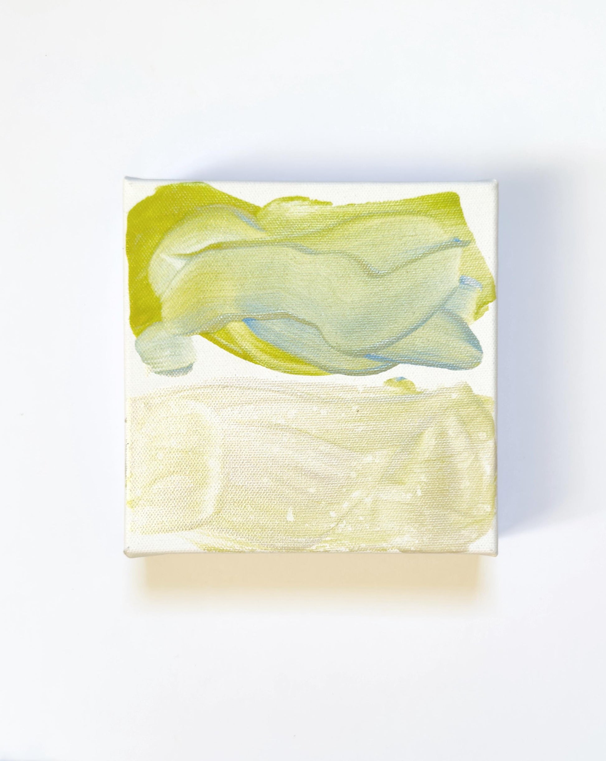 Original Abstract Mixed Media Landscape Painting, Size 4”x4” on Stretched Canvas. Primary colors are blue, green, and metallic white.