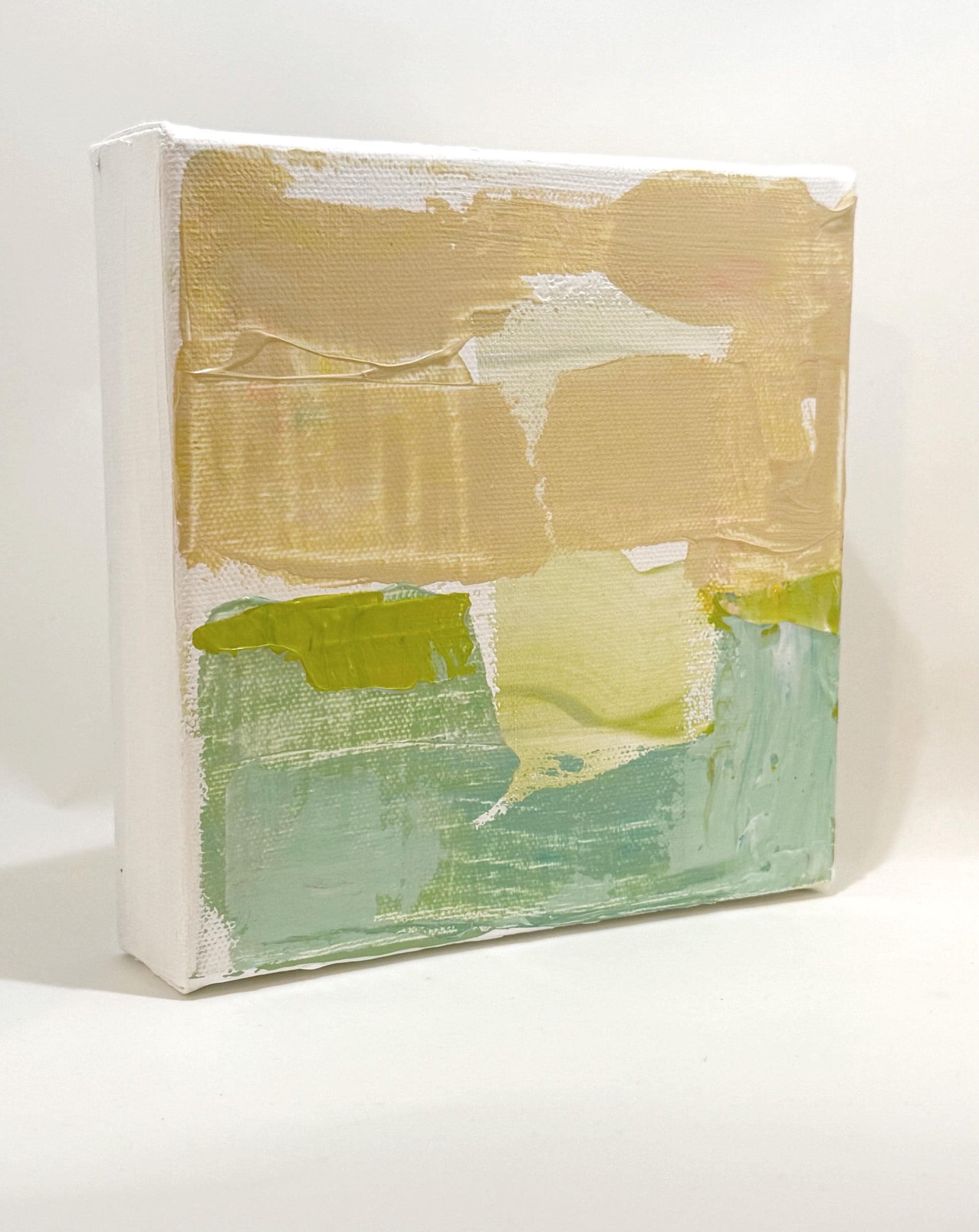 Original abstract landscape mixed media painting on stretched canvas (size 6”x6”). Primary colors are pink and green hues with a touch of chartreuse.
