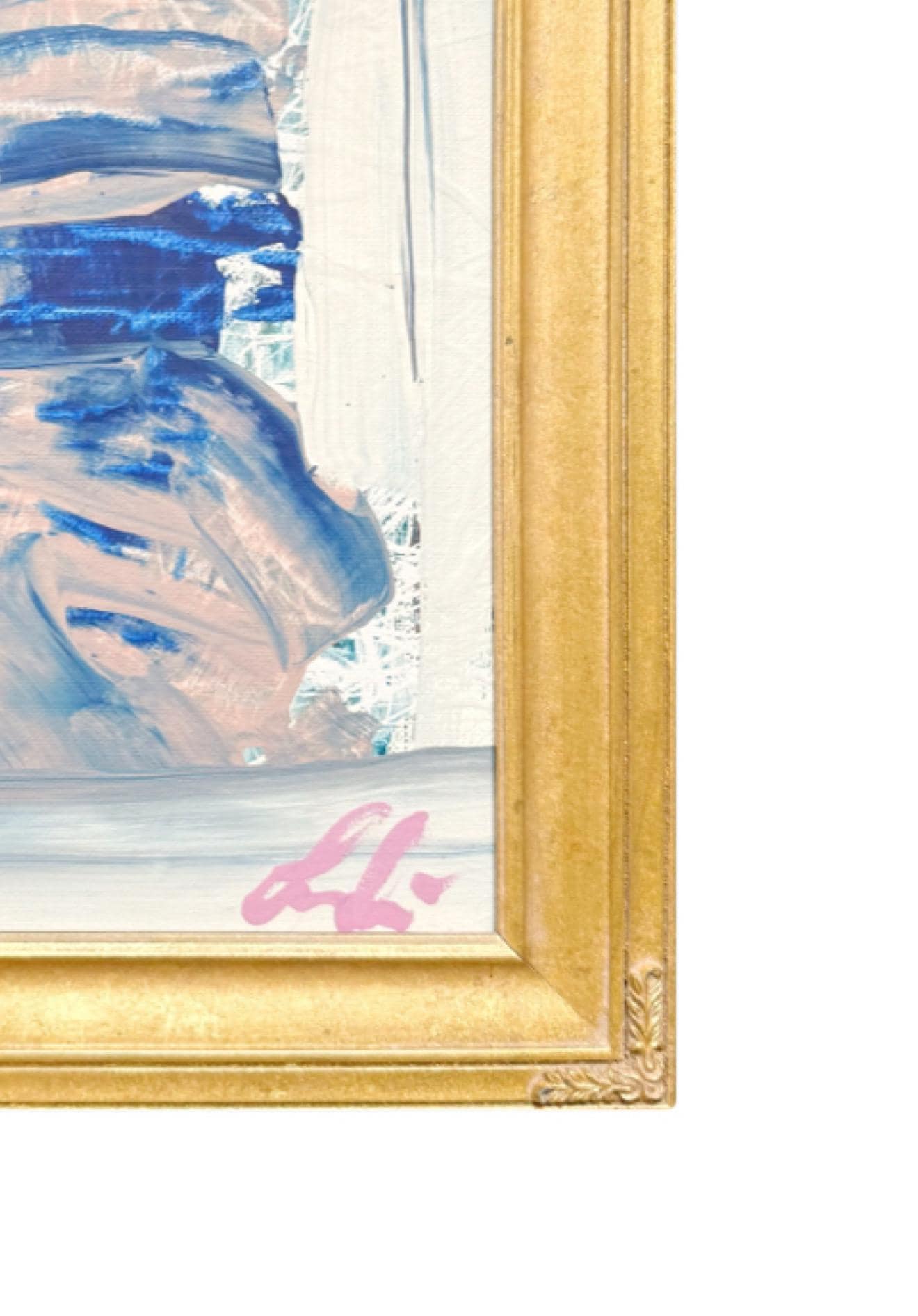 This listing is for an original abstract mixed media painting (size 8”x10”) on canvas framed in a gold-leaf ornate frame. The painting is framed in a vintage gold-leafed frame (size 8”x10”). Primary colors are blue, pink, and white. Mediums include watercolor and pastels and the minimalist color palette will compliment almost any decor. This painting will arrive framed and ready to hang in your desired space.