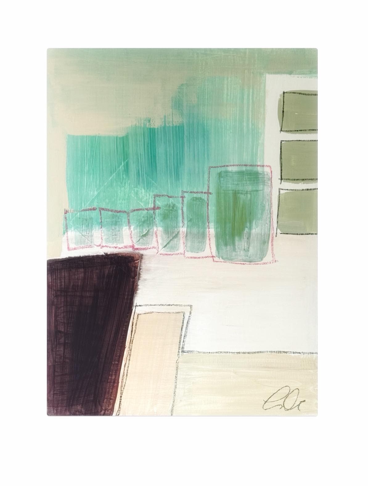 This listing is for an original abstract mixed media painting on canvas (size 12x18x1.5). Primary colors includes shades of green, pink, and taupe.