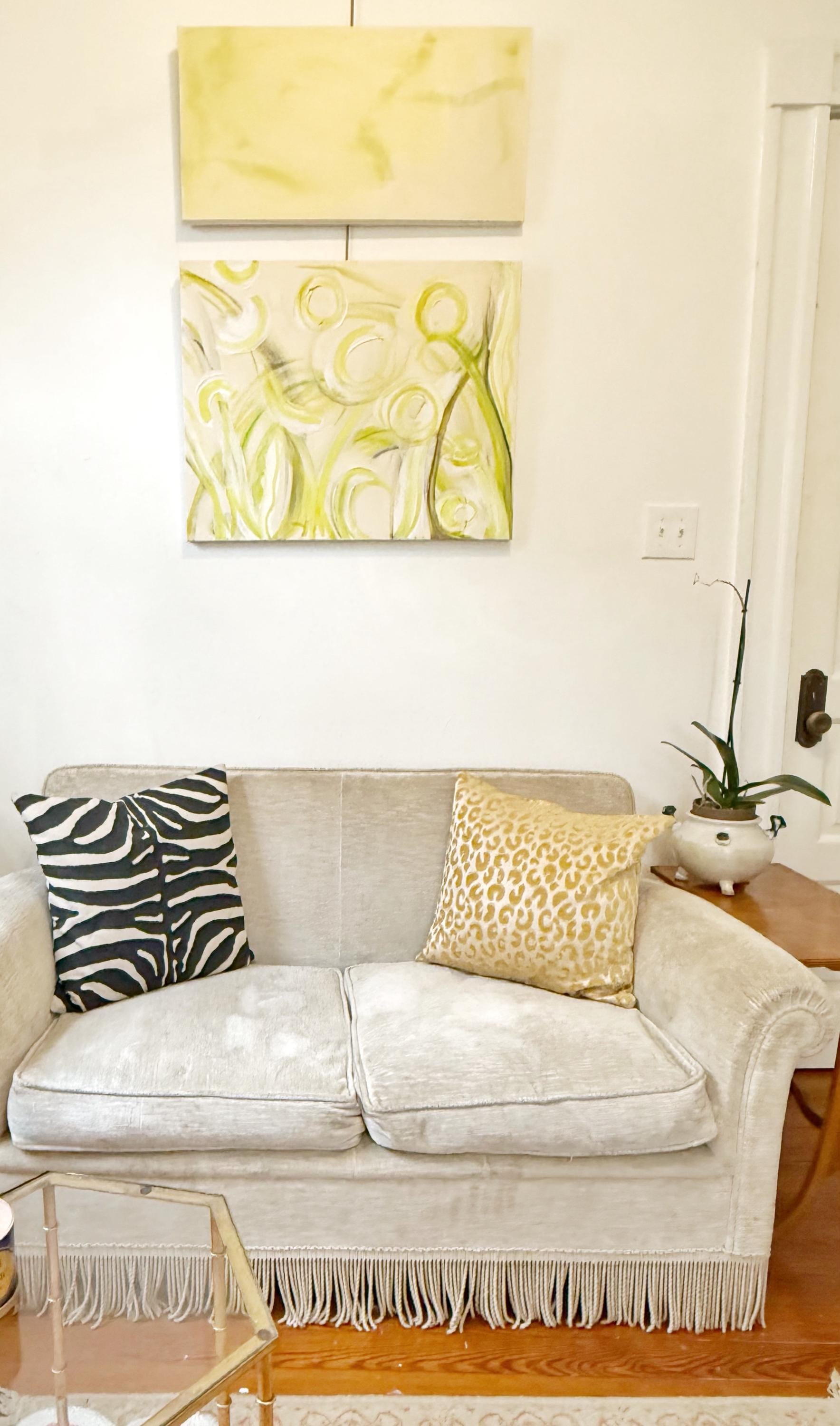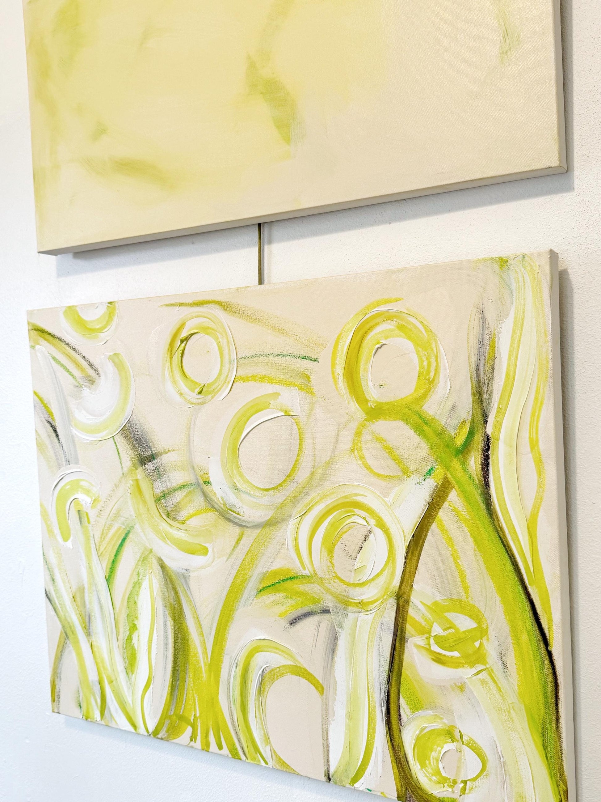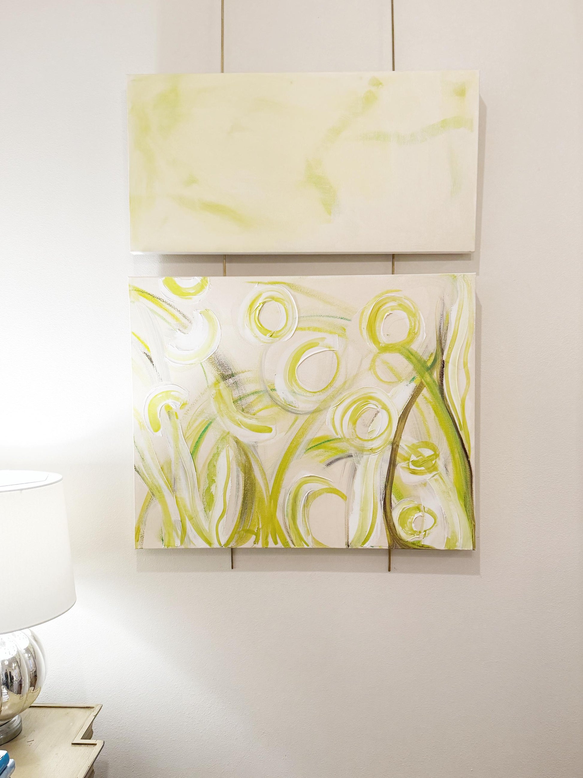 This listing is for an original abstract dyptic painting on canvas and includes two separate canvases. The larger canvas measures 48”x36” and the smaller canvas measures 12”x48”. This painting is titled “Firmament” and the primary colors are shades of light pink, green hues, and white undertones. This painting is very neutral and would complement a variety of decor styles. Mediums include acrylic paint, pastels, glass beads, and iridescent medium. The listing price includes shipping. French hanging rods are not included however can be added to the order for an additional fee upon request. Please reach out for specific measurements or for any custom order requests.