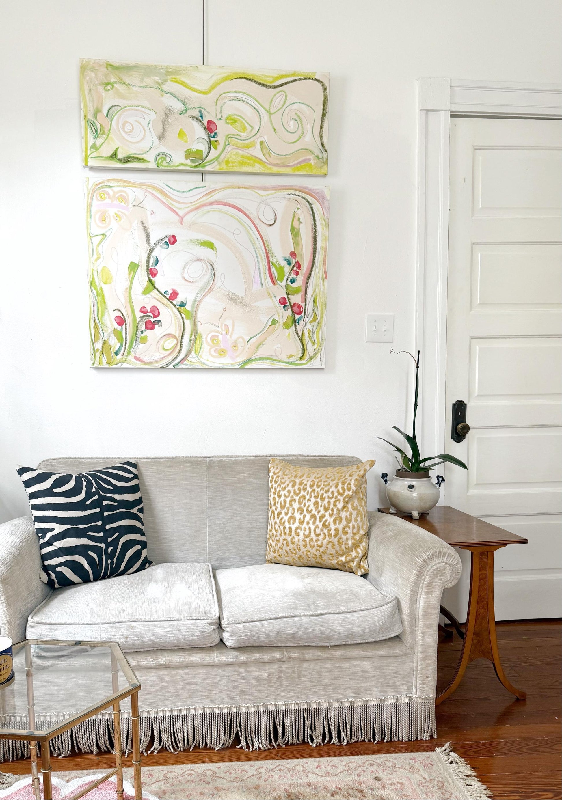 This listing is for an original abstract dyptic painting on canvas and includes two separate canvases. The larger canvas measures 48”x36” and the smaller canvas measures 12”x48”. This painting is titled Garden of Eden and the primary colors are shades of pink, green hues, and white undertones. This painting includes several mediums including acrylic paint, pastels, glass beads, and iridescent medium. The listing price includes shipping. French hanging rods are not included however can be added to the order for an additional fee if requested. Please reach out for specific measurements or for any custom order requests.