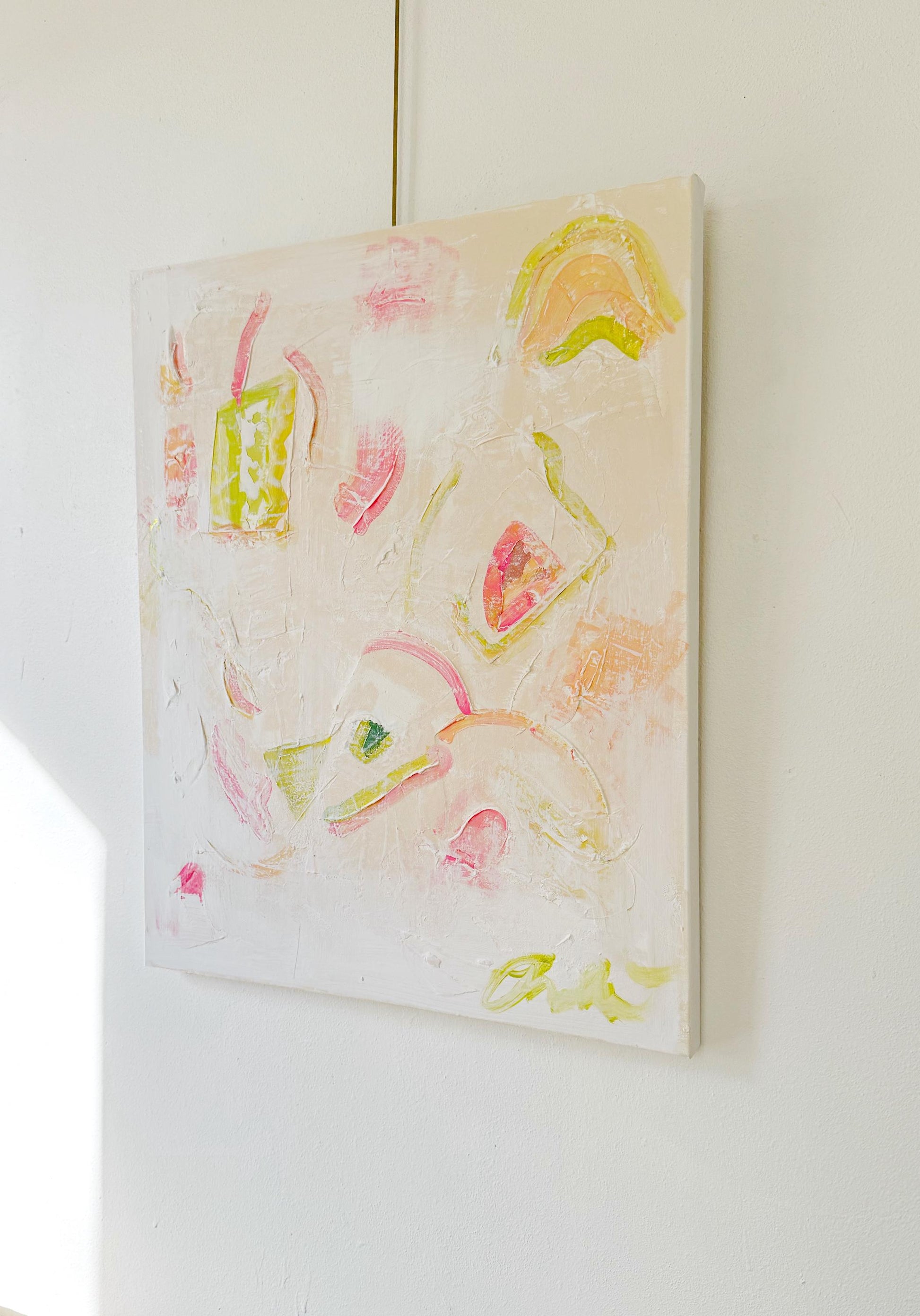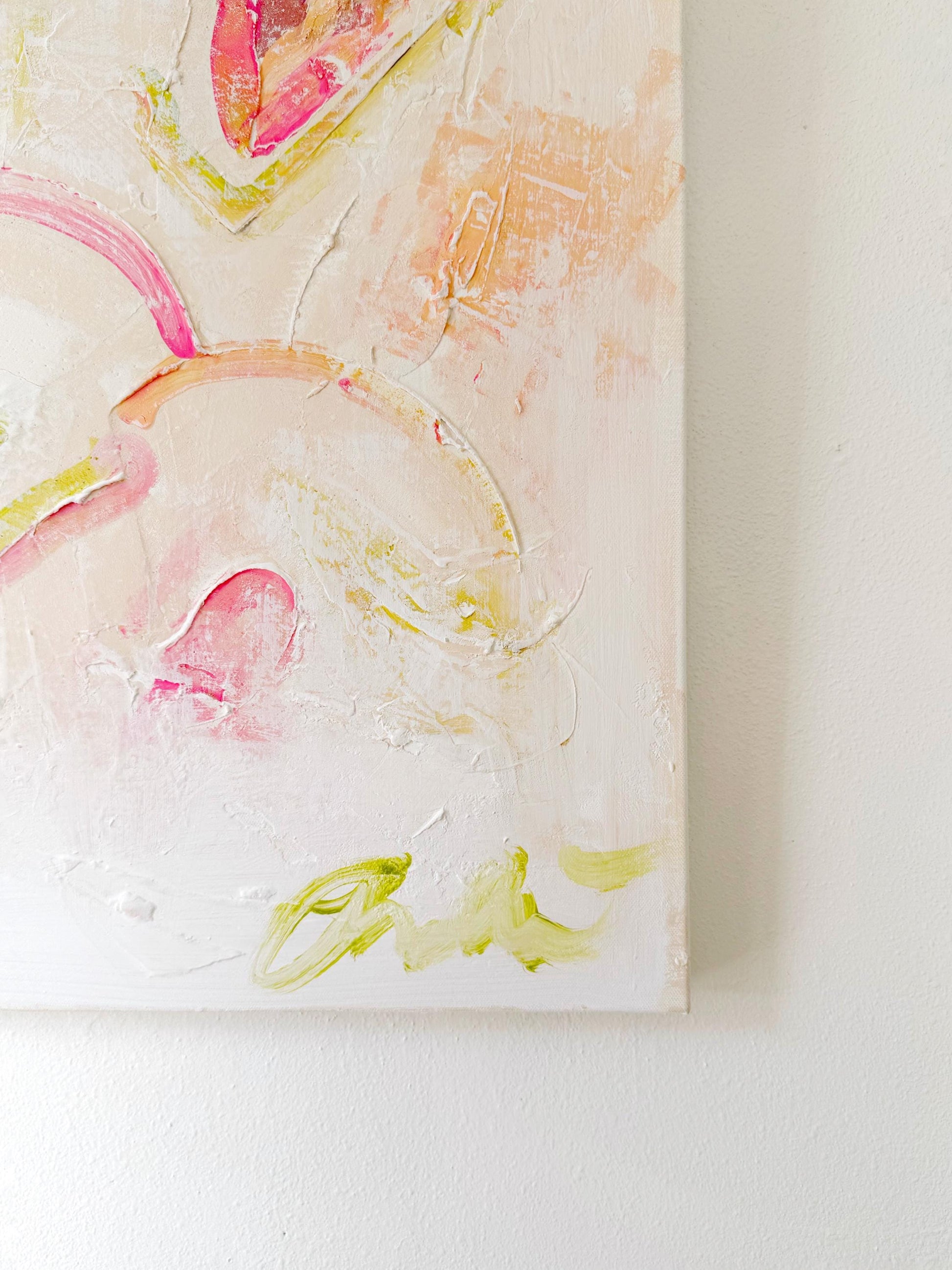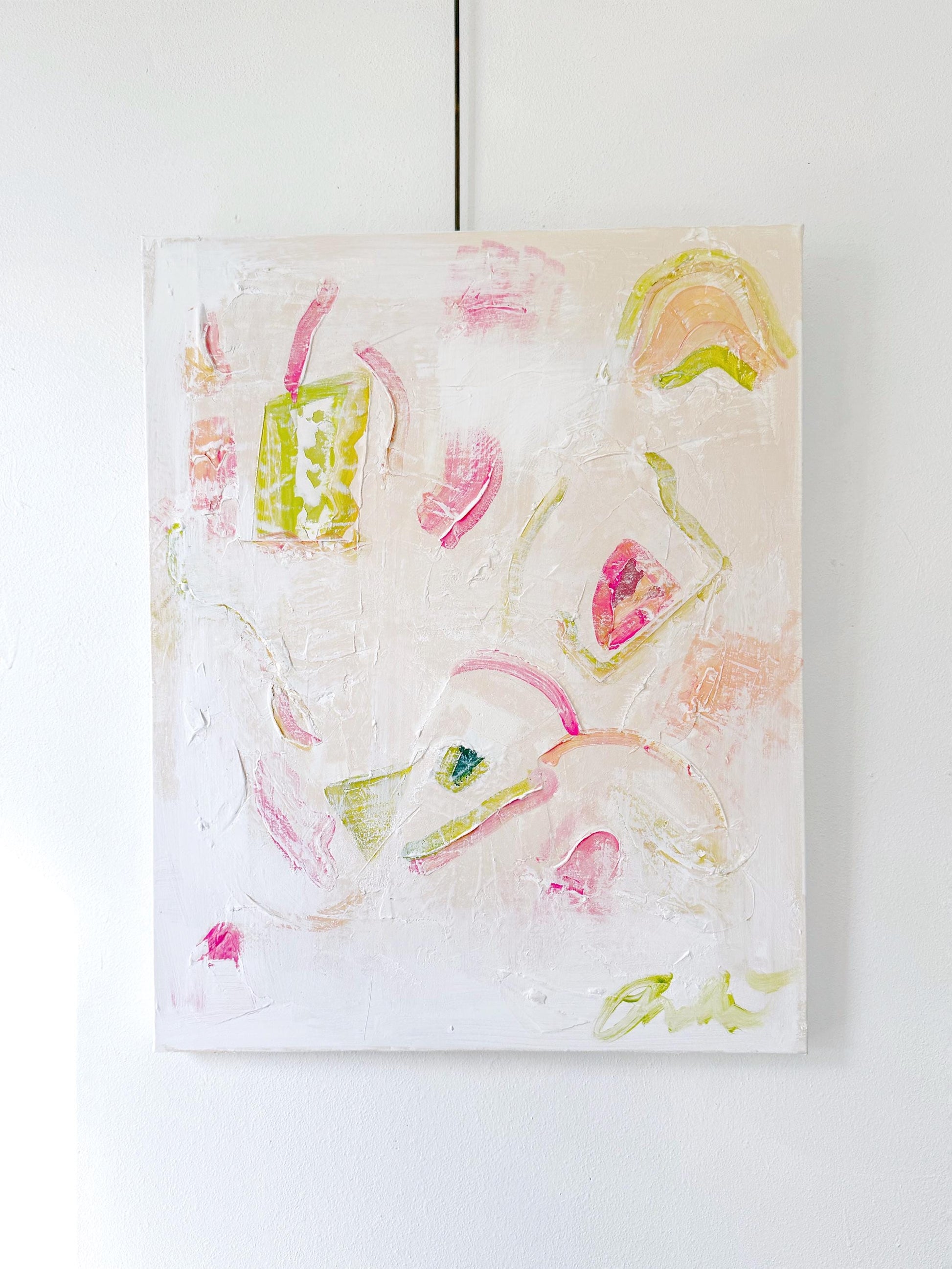 Original Abstract Mixed Media Painting on Stretched Canvas (size 24”x30”). Primary colors are shades of white and light pink with a touch of chartreuse. Overall, this painting is very neutral and would complement almost any decor. Painting will arrive ready to hang in your desired space. Listing price includes shipping.