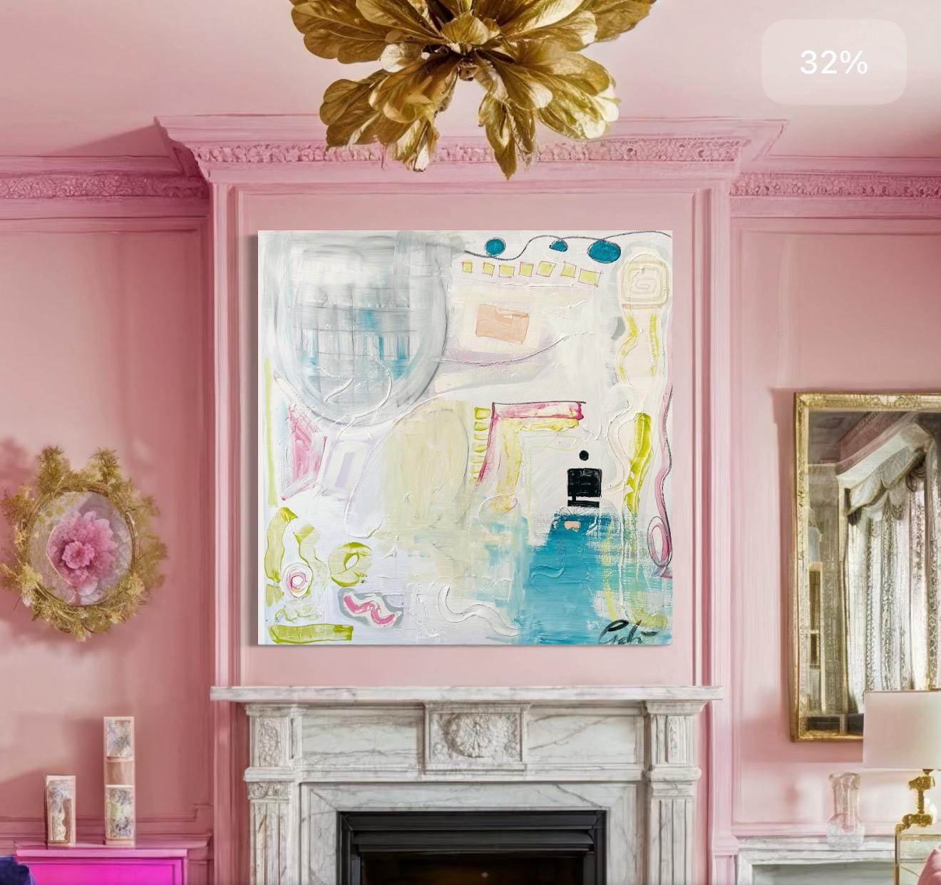 Original Abstract Mixed Media Painting on Stretched Canvas (size 36”x36”). Primary colors are shades of white, pink, and turqoise with a touch of chartreuse and black. Overall, this painting is very neutral and would complement almost any decor. Painting will arrive ready to hang in your desired space. Listing price includes shipping.