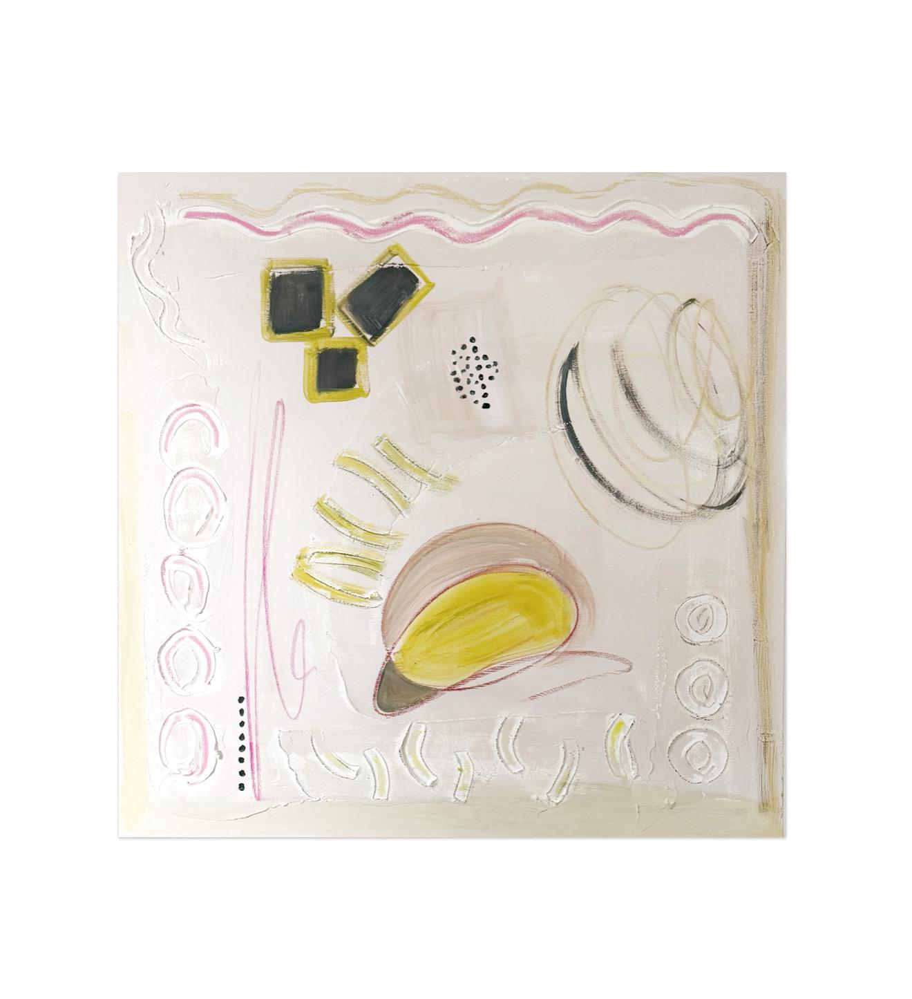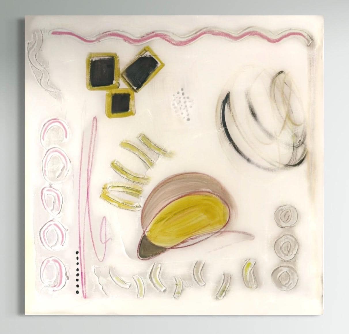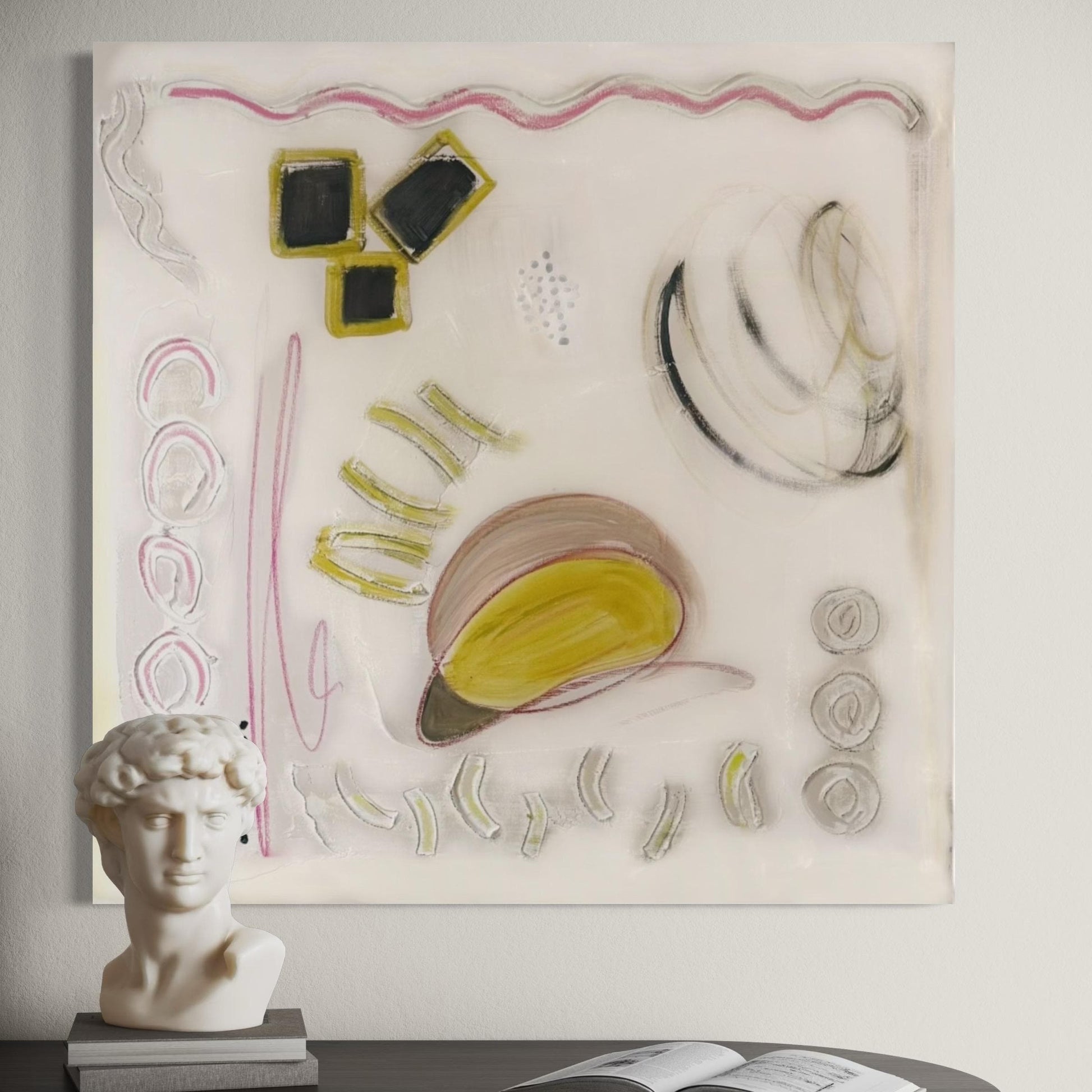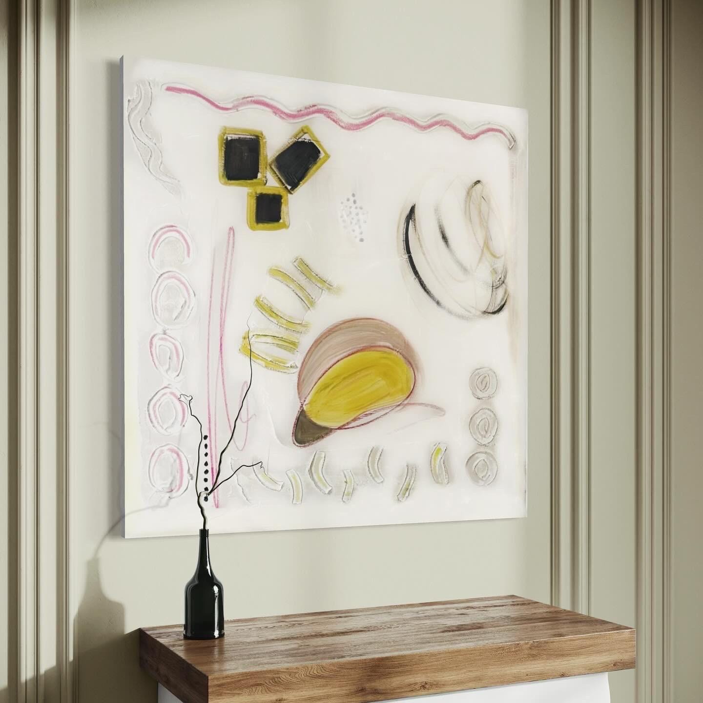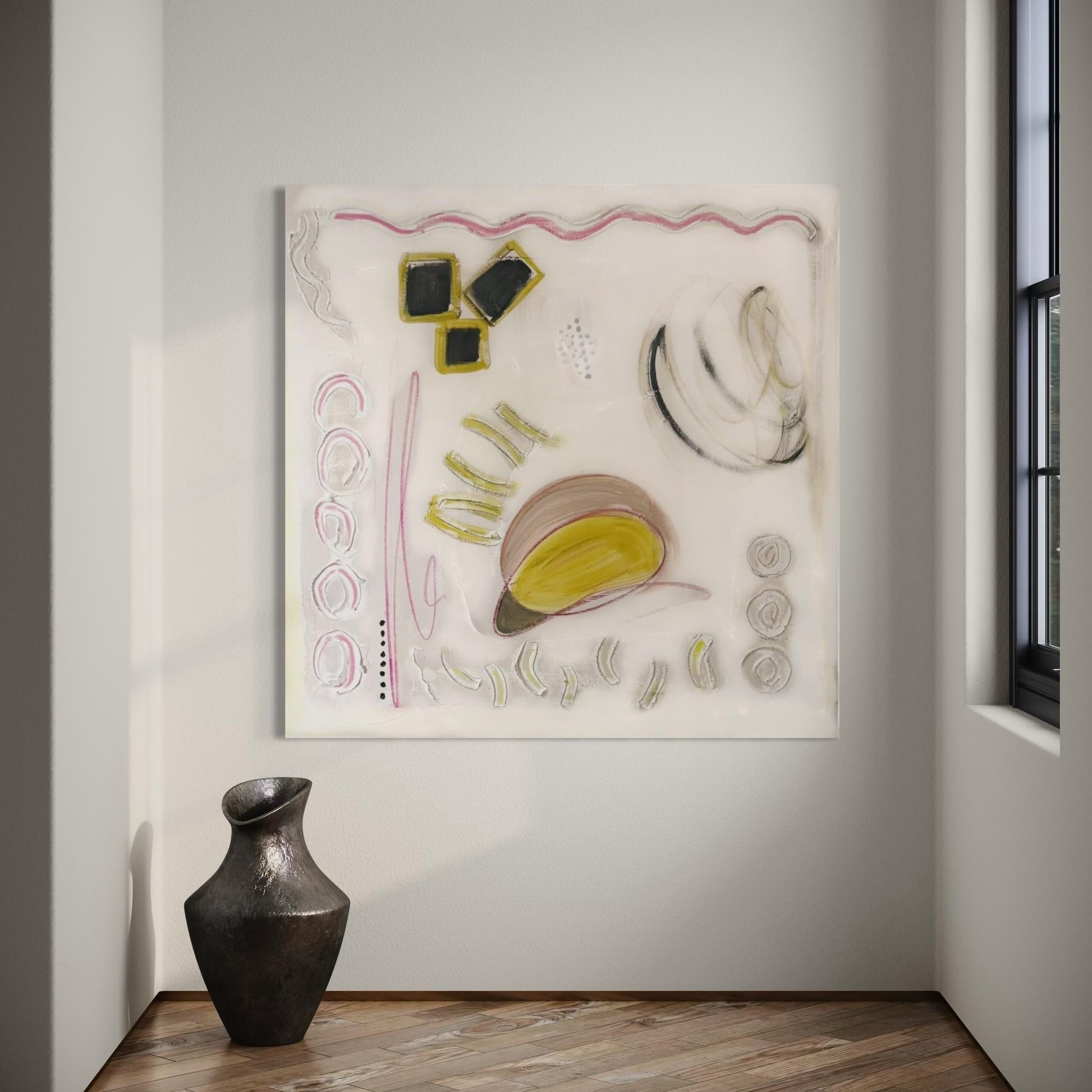 Original Abstract Mixed Media Painting on Stretched Canvas (size 36”x36”). Primary colors are shades of white, pink, and turqoise with a touch of chartreuse and black. Overall, this painting is very neutral and would complement almost any decor. Painting will arrive ready to hang in your desired space. Listing price includes shipping.