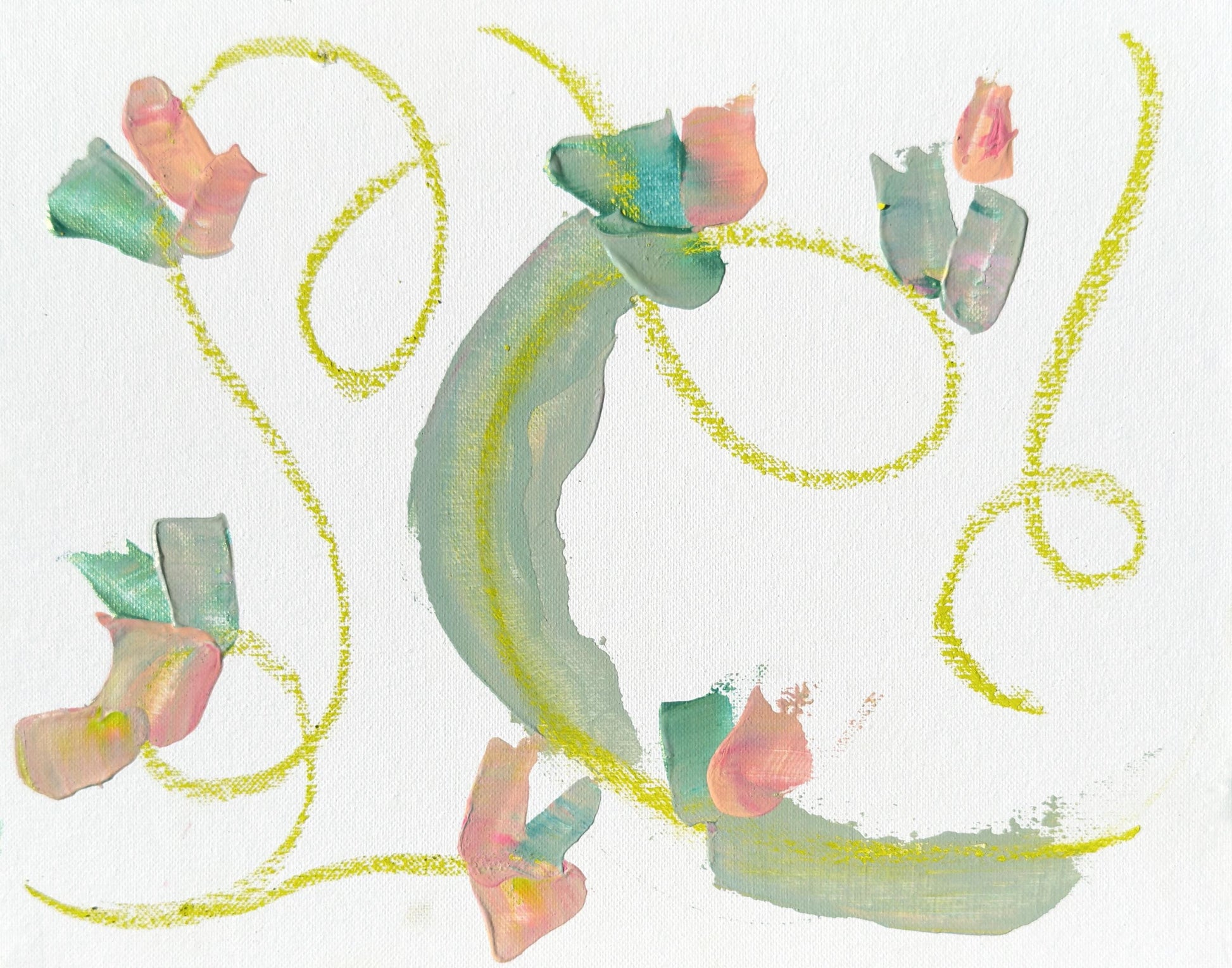 Original abstract mixed media painting on canvas (size 11”x14”) matted in a white bevel-cut core mat and framed in a gold metal gallery frame (size 16”x20”). Primary colors are green and pink hues with touches of chartreuse. This painting will arrive ready to hang in your desired space.